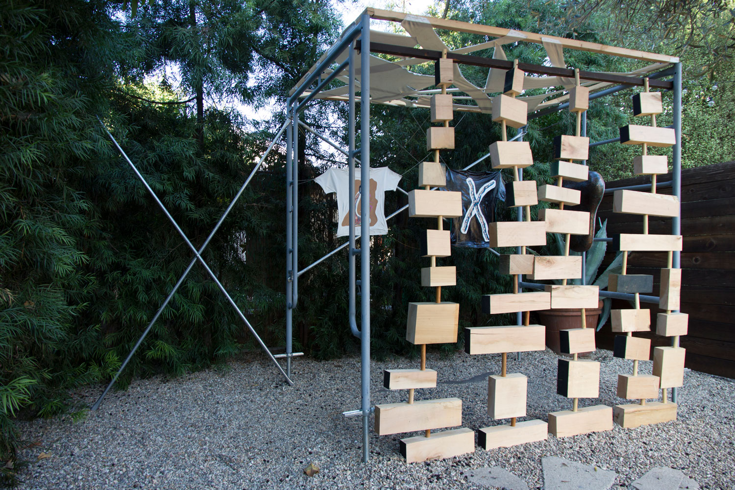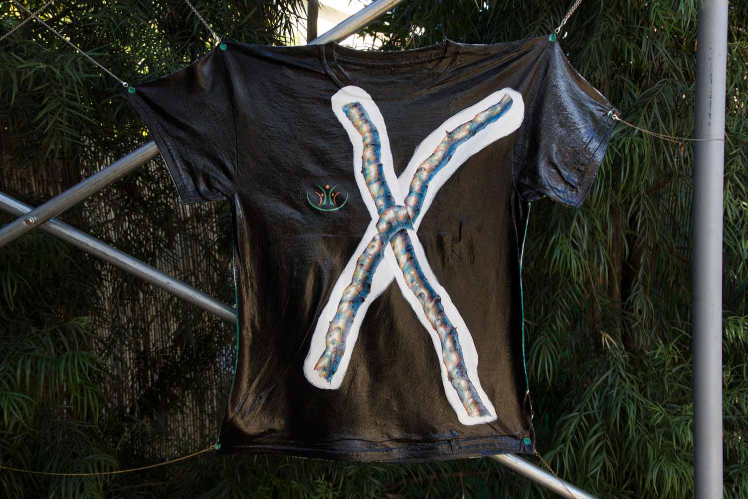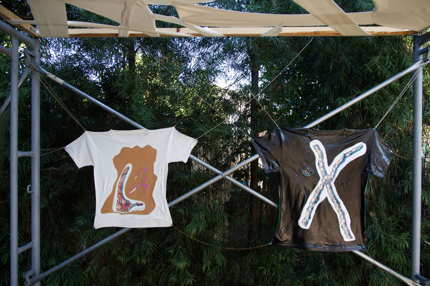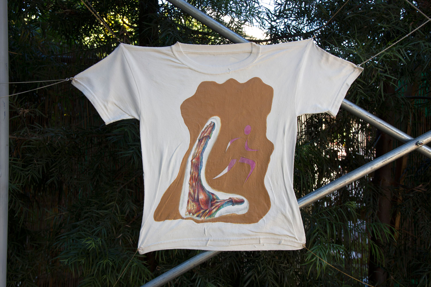 runoff, excess, one-time use. Recycled assembly line labor, lined figure, line drawing, colored pencil on t-shirt (flat) (2019). Workout activity in the workplace